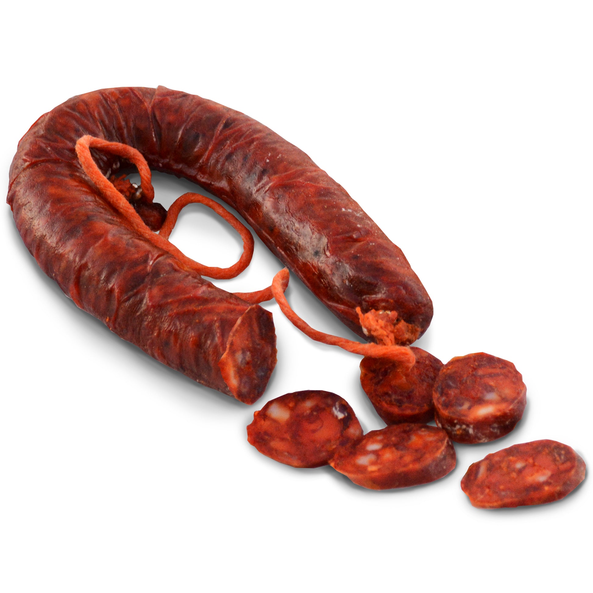 Chorizo elaborado con la receta familiar conservada durante tres generaciones, se emplean carnes escogidas de animal, tripa natural y especias de primera calidad. La curación y maduración muy lenta consigue un aroma y gusto excepcional.